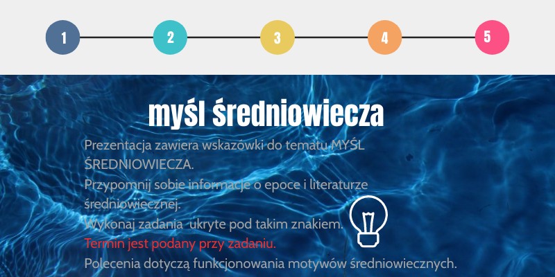 Prezentacja zawiera wskazówki do tematu MYŚL ŚREDNIOWIECZA. Przypomnij sobie informacje o epoce i literaturze średniowiecznej. Wykonaj zadania ukryte pod takim znakiem. Termin jest podany przy zadaniu. Polecenia dotyczą funkcjonowania motywów średniowiecznych.
