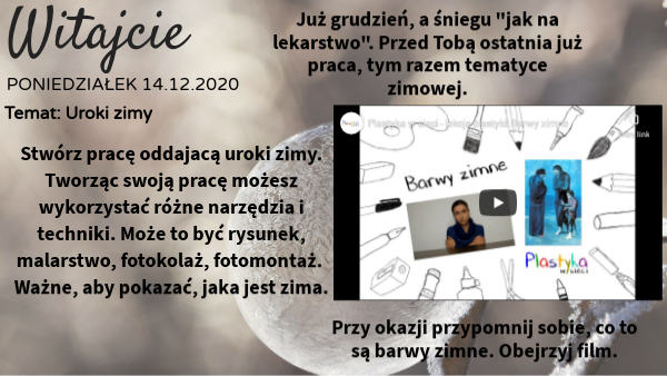 Stwórz pracę oddajacą uroki zimy. Tworząc swoją pracę możesz wykorzystać różne narzędzia i techniki. Może to być rysunek, malarstwo, fotokolaż, fotomontaż. Ważne, aby pokazać, jaka jest zima.