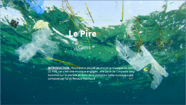 Nous avons décidé de choisir la musique de GIMS/ LE PIRE car c’est une musique engagée , elle parle de l’impacte des hommes sur la planète et donc de la pollution