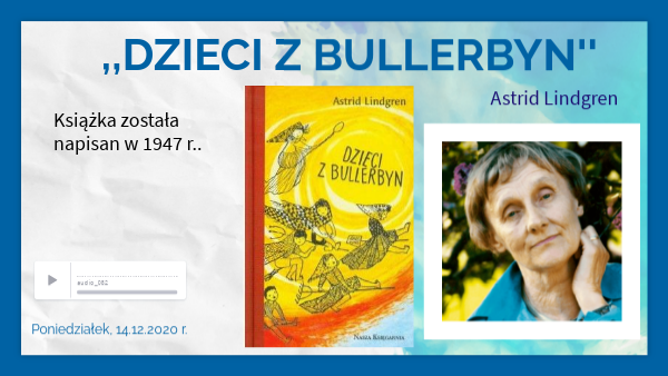 Książka pt. ,,Dzieci z Bullerbyn" została napisana przez szwedzką pisarkę Astrid Lindgren. Opowiada o życiu zaprzyjaźnionych dzieci. Poznajemy ich ciekawe przygody, czytamy o tym, jak się bawią, uczą i jak pomagają rodzicom. Zadanie - na jutro Napiszę, która przygoda dzieci z Bullerbyn najbardziej mi się podobała. (kilka zdań)Zrobię rysunek do niej.
