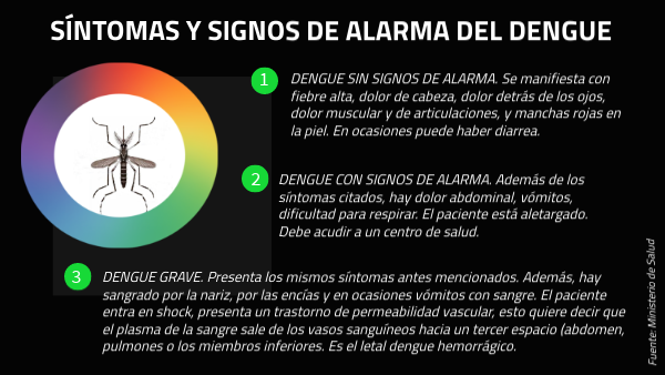 DENGUE CON SIGNOS DE ALARMA. Además de los síntomas citados, hay dolor abdominal, vómitos, dificultad para respirar. El paciente está aletargado. Debe acudir a un centro de salud.