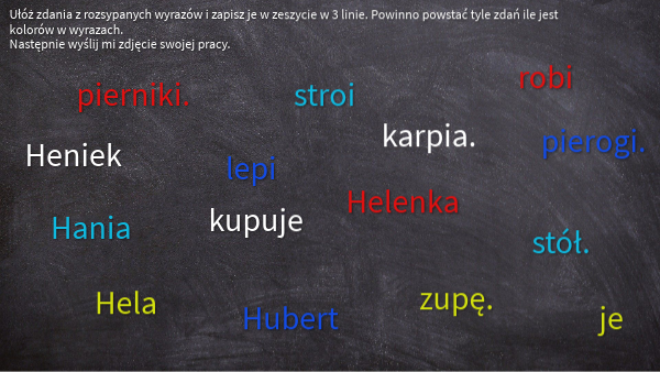 Ułóż zdania z rozsypanych wyrazów i zapisz je w zeszycie w 3 linie. Powinno powstać tyle zdań ile jest kolorów w wyrazach. Następnie wyślij mi zdjęcie swojej pracy.