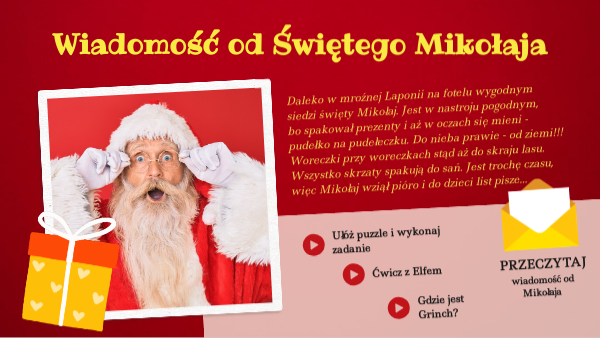 Daleko w mroźnej Laponii na fotelu wygodnym siedzi święty Mikołaj. Jest w nastroju pogodnym, bo spakował prezenty i aż w oczach się mieni - pudełko na pudełeczku. Do nieba prawie - od ziemi!!! Woreczki przy woreczkach stąd aż do skraju lasu. Wszystko skrzaty spakują do sań. Jest trochę czasu, więc Mikołaj wziął pióro i do dzieci list pisze…