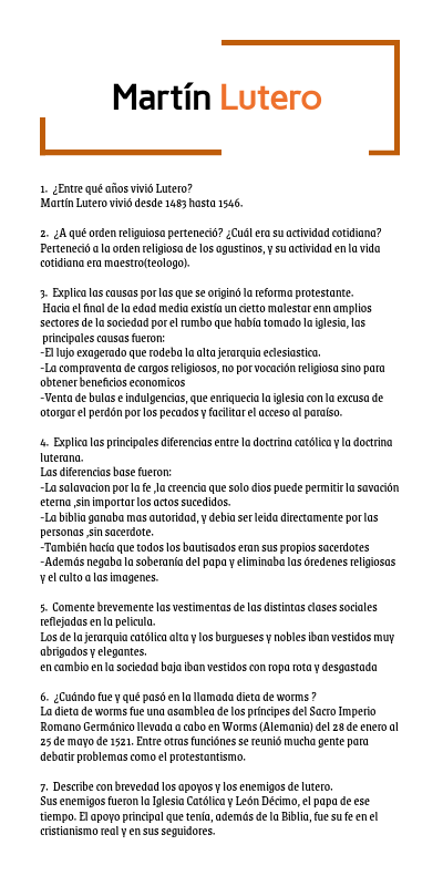 1. ¿Entre qué años vivió Lutero? Martín Lutero vivió desde 1483 hasta 1546. 2. ¿A qué orden religuiosa perteneció? ¿Cuál era su actividad cotidiana? Perteneció a la orden religiosa de los agustinos, y su actividad en la vida cotidiana era maestro(teologo). 3. Explica las causas por las que se originó la reforma protestante. Hacia el final de la edad media existía un cietto malestar enn amplios sectores de la sociedad por el rumbo que había tomado la iglesia, las principales causas fueron: -El lujo exagerado que rodeba la alta jerarquia eclesiastica. -La compraventa de cargos religiosos, no por vocación religiosa sino para obtener beneficios economicos -Venta de bulas e indulgencias, que enriquecia la iglesia con la excusa de otorgar el perdón por los pecados y facilitar el acceso al paraíso. 4. Explica las principales diferencias entre la doctrina católica y la doctrina luterana. Las diferencias base fueron: -La salavacion por la fe ,la creencia que solo dios puede permitir la savación eterna ,sin importar los actos sucedidos. -La biblia ganaba mas autoridad, y debia ser leida directamente por las personas ,sin sacerdote. -También hacía que todos los bautisados eran sus propios sacerdotes -Además negaba la soberanía del papa y eliminaba las óredenes religiosas y el culto a las imagenes. 5. Comente brevemente las vestimentas de las distintas clases sociales reflejadas en la pelicula. Los de la jerarquia católica alta y los burgueses y nobles iban vestidos muy abrigados y elegantes. en cambio en la sociedad baja iban vestidos con ropa rota y desgastada 6. ¿Cuándo fue y qué pasó en la llamada dieta de worms ? La dieta de worms fue una asamblea de los príncipes del Sacro Imperio Romano Germánico llevada a cabo en Worms (Alemania) del 28 de enero al 25 de mayo de 1521. Entre otras funciónes se reunió mucha gente para debatir problemas como el protestantismo. 7. Describe con brevedad los apoyos y los enemigos de lutero. Sus enemigos fueron la Iglesia Católica y León Décimo, el papa de ese tiempo. El apoyo principal que tenía, además de la Biblia, fue su fe en el cristianismo real y en sus seguidores.