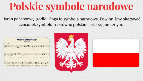 Hymn państwowy, godło i flaga to symbole narodowe. Powinniśmy okazywać szacunek symbolom zarówno polskim, jak i zagranicznym.