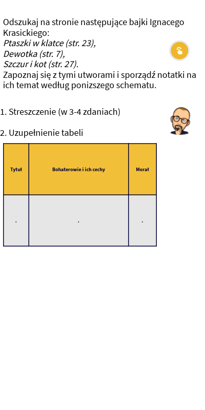 Odszukaj na stronie następujące bajki Ignacego Krasickiego:Ptaszki w klatce (str. 23), Dewotka (str. 7), Szczur i kot (str. 27). Zapoznaj się z tymi utworami i sporządź notatki na ich temat według ponizszego schematu.
