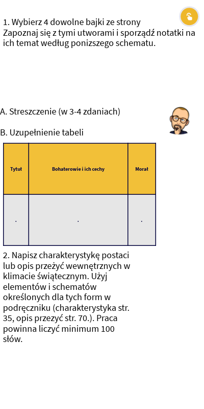 A. Streszczenie (w 3-4 zdaniach) B. Uzupełnienie tabeli
