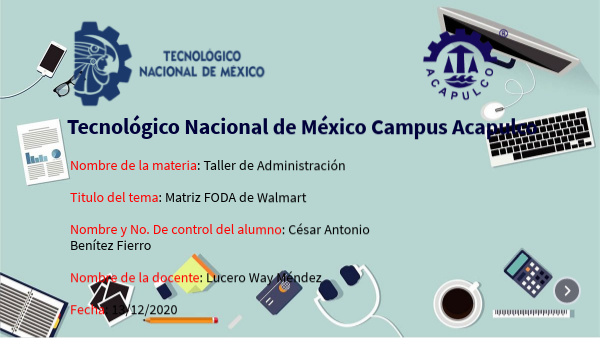 Nombre de la materia: Taller de Administración Titulo del tema: Matriz FODA de Walmart Nombre y No. De control del alumno: César Antonio Benítez Fierro Nombre de la docente: Lucero Way Méndez Fecha: 13/12/2020