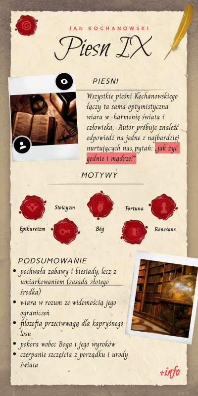 Wszystkie pieśni Kochanowskiego łączy ta sama optymistyczna wiara w harmonię świata i człowieka, Autor próbuje znaleźć odpowiedź na jedne z najbardziej nurtujących nas pytań: ,,jak żyć godnie i mądrze?"