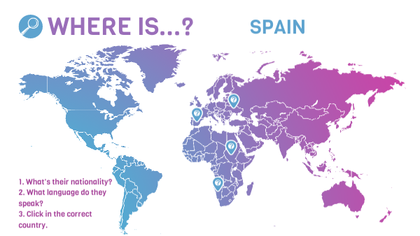 1. What's their nationality?2. What language do they speak?3. Click in the correct country.