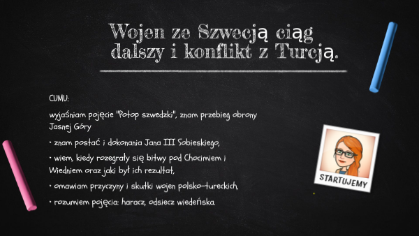 CUMU: wyjaśniam pojęcie "Potop szwedzki", znam przebieg obrony Jasnej Góry • znam postać i dokonania Jana III Sobieskiego, • wiem, kiedy rozegrały się bitwy pod Chocimiem i Wiedniem oraz jaki był ich rezultat, • omawiam przyczyny i skutki wojen polsko-tureckich, • rozumiem pojęcia: haracz, odsiecz wiedeńska.