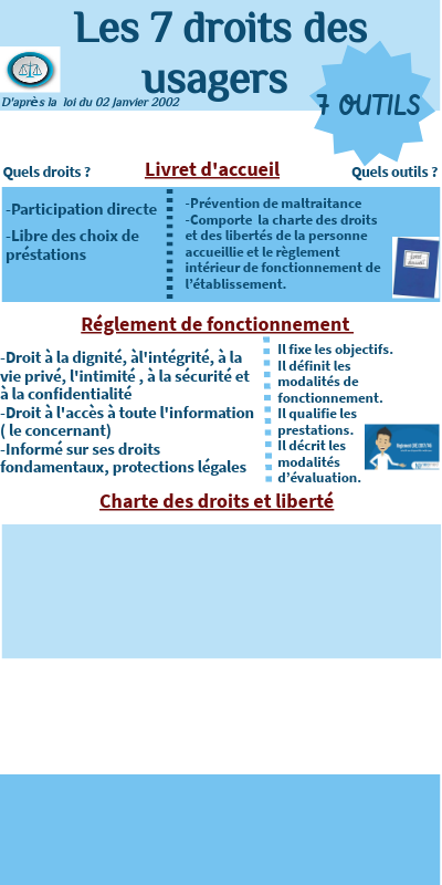 -Prévention de maltraitance -Comporte la charte des droits et des libertés de la personne accueillie et le règlement intérieur de fonctionnement de l’établissement.