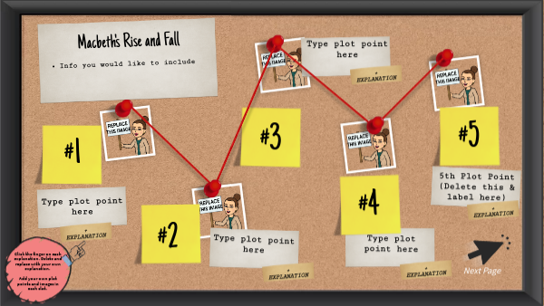 Click the finger on each explanation. Delete and replace with your own explanation. Add your own plot points and images in each slot.
