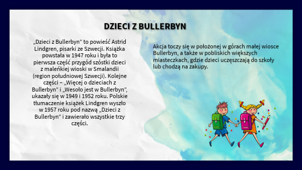 Astrid Lindgren - była szwedzką pisarką. Jej książki są czytane na całym świecie i zostały przetłumaczone na wiele języków. Do najbardziej znanych książek Astrid Lindgren należą: Dzieci Bullerbyn, Fizia Pończoszanka, Bracia Lwie Serce, Mio mój Mio, Rycerz Białej Róży i wiele innych.