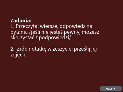 Zadania:1. Przeczytaj wiersze, odpowiedz na pytania /jeśli nie jesteś pewny, możesz skorzystać z podpowiedzi/ 2. Zrób notatkę w zeszyciei prześlij jej zdjęcie.