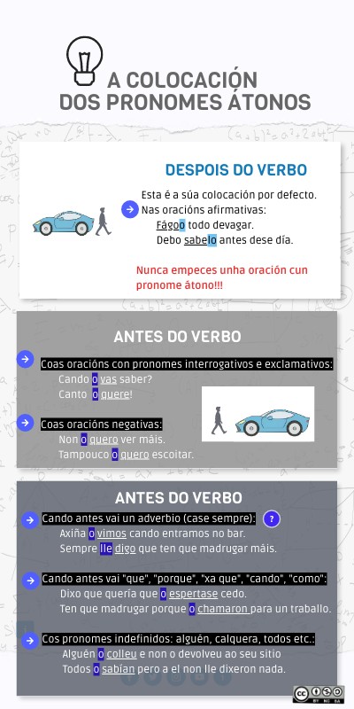 Esta é a súa colocación por defecto. Nas oracións afirmativas: Fágoo todo devagar. Debo sabelo antes dese día. Nunca empeces unha oración cun pronome átono!!!