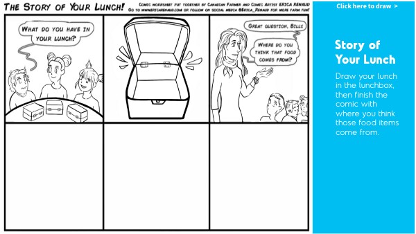 Draw your lunch in the lunchbox, then finish the comic with where you think those food items come from.