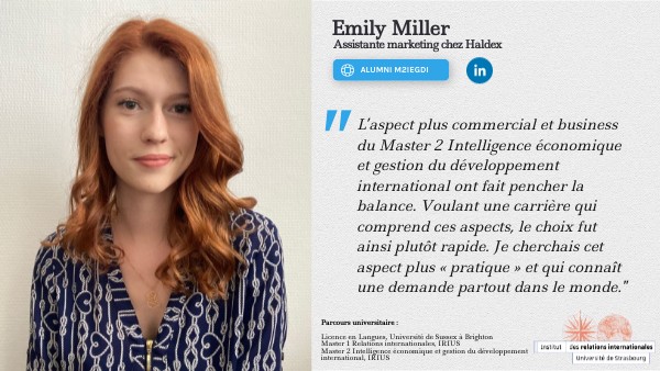 Pourquoi l'ITIRI ? L’aspect plus commercial et business du Master 2 Intelligence économique et gestion du développement international ont fait pencher la balance. Voulant une carrière qui comprend ces aspects, le choix fut ainsi plutôt rapide. Je cherchais cet aspect plus « pratique » et qui connaît une demande partout dans le monde.