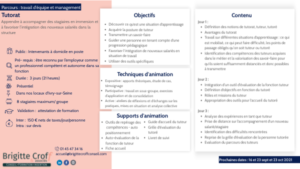 - Identification des compétences des tuteurs acquises dans le métier et la valorisation des savoir-faire pour qu’ils soient suffisamment distanciés et donc possibles à transmettre