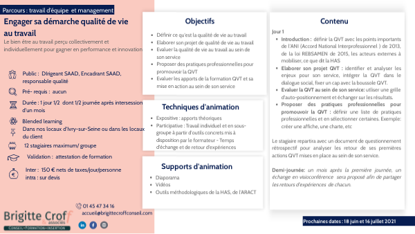 - Elaborer son projet QVT : identifier et analyser les enjeux pour son service, intégrer la QVT dans le dialogue social, fixer un cap avec la boussole QVT.