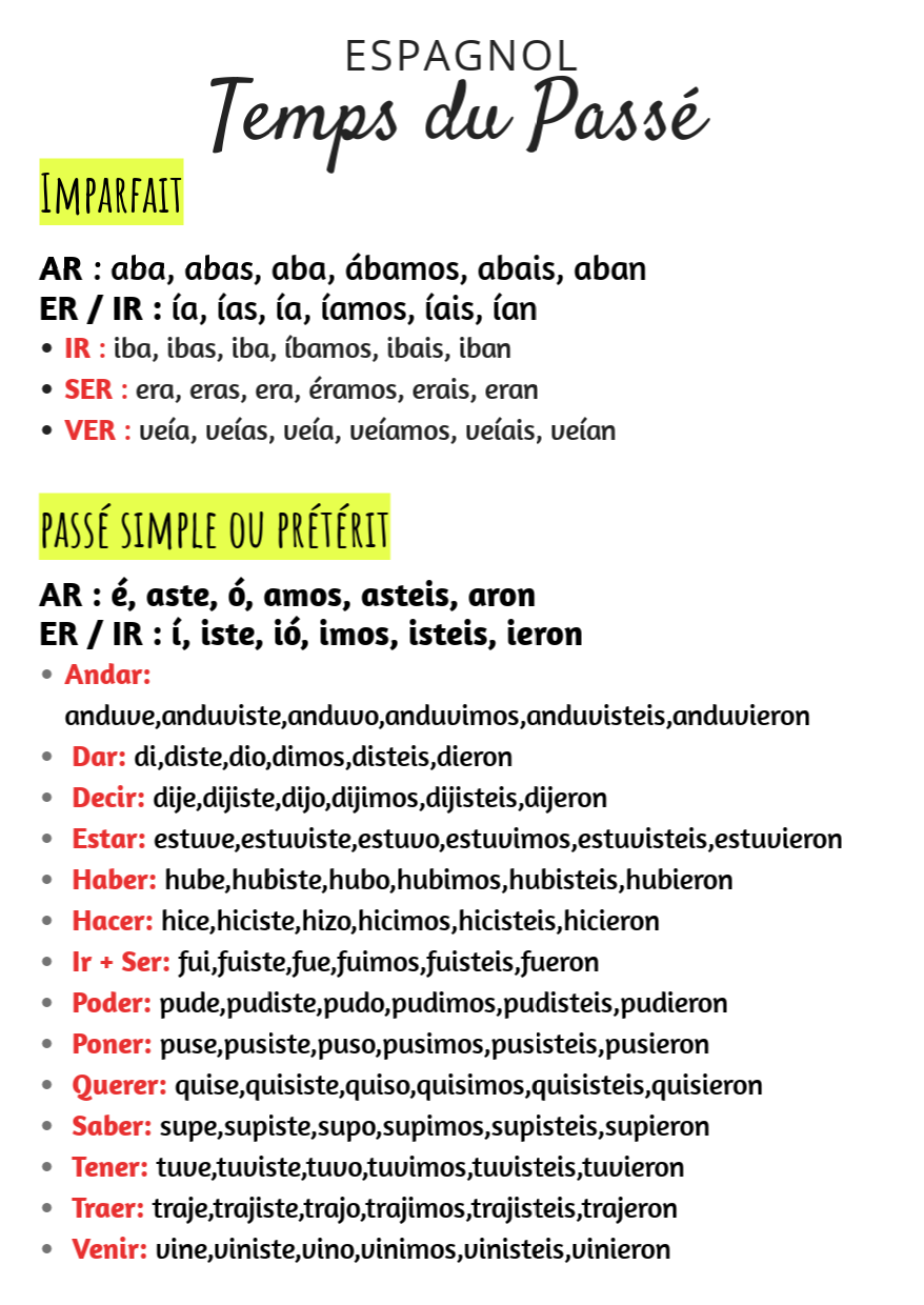 AR : aba, abas, aba, ábamos, abais, aban ER / IR : ía, ías, ía, íamos, íais, ían