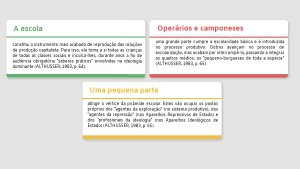 uma grande parte cumpre a escolaridade básica e é introduzida no processo produtivo. Outros avançam no processo de escolarização, mas acabam por interrompê-lo, passando a integrar os quadros médios, os "pequeno-burgueses de toda a espécie" (ALTHUSSER, 1983, p. 65).