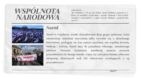 Naród to wspólnota, trwale ukształtowana duża grupa społeczna, która zamieszkuje określone terytorium (albo wywodzi się z określonego terytorium), posługuje się tym samym językiem, ma wspólną historię, tradycję i kulturę. Naród dąży do posiadania własnego, niezależnego państwa. Poczucie tożsamości narodowej oznacza poczucie przynależności do danego narodu, wiąże się z przypisywaniem sobie oraz akceptacją określonych cech lub właściwości wynikających z tej przynależności.