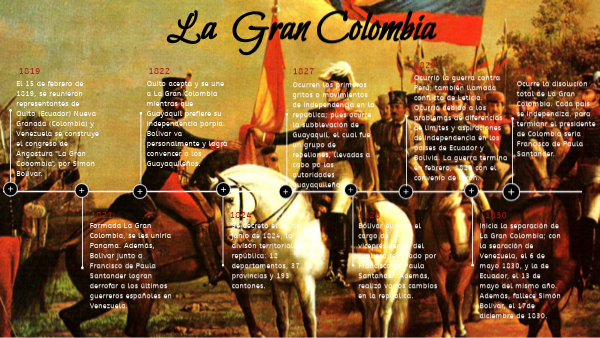 Inicia la separación de La Gran Colombia; con la searación de Venezuela, el 6 de mayo 1830, y la de Ecuador, el 13 de mayo del mismo año. Además, fallece Simón Bolívar, el 17de diciembre de 1830.