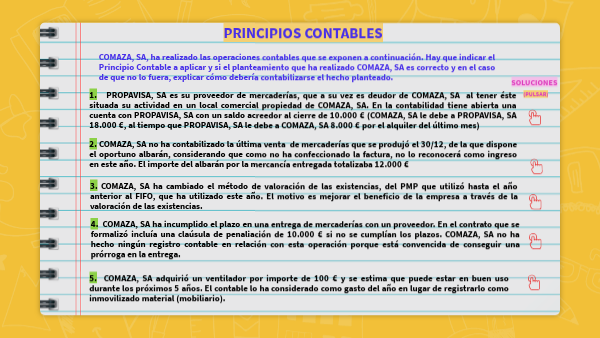 COMAZA, SA, ha realizado las operaciones contables que se exponen a continuación. Hay que indicar el Principio Contable a aplicar y si el planteamiento que ha realizado COMAZA, SA es correcto y en el caso de que no lo fuera, explicar cómo debería contabilizarse el hecho planteado.