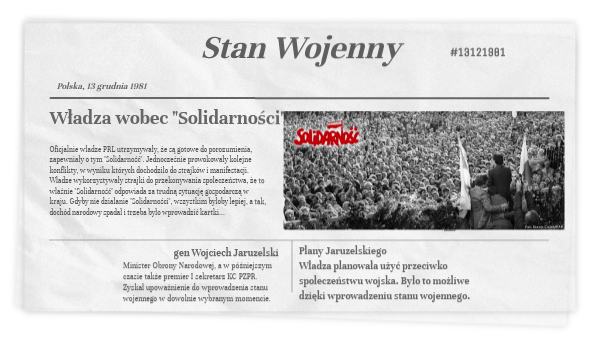 Plany JaruzelskiegoWładza planowała użyć przeciwko społeczeństwu wojska. Było to możliwe dzięki wprowadzeniu stanu wojennego.