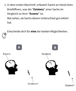 - In dem ersten Abschnitt erläutert Sartre an Hand eines Brieföffners, was die "Existenz" einer Sache im Vergleich zu ihrer "Essenz" ist.Mal sehen, ob Sartre diesen Unterschied gut erklärthat.Entscheide dich für eine der beiden Möglichkeiten.