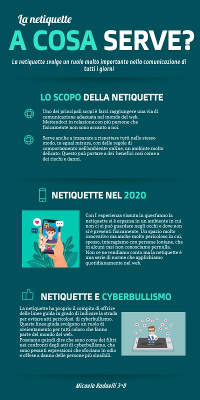 Con l' esperienza vissuta in quest'anno la netiquette si è espansa in un ambiente in cui non ci si può guardare negli occhi e dove non si è presenti fisicamente. Un spazio molto innovativo ma anche molto pericoloso in cui, spesso, interagiamo con persone lontane, che in alcuni casi non conosciamo pernulla. Non ce ne rendiamo conto ma la netiquette è una serie di norme che applichiamo quotidianamente nel web.