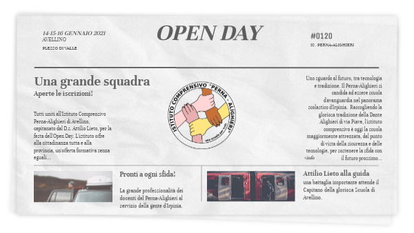 Tutti uniti all'Istituto Comprensivo Perna-Alighieri di Avellino, capitanato dal D.s. Attilio Lieto, per la festa dell'Open Day. L'istituto offre alla cittadinanza tutta e alla provincia, un'offerta formativa senza eguali...