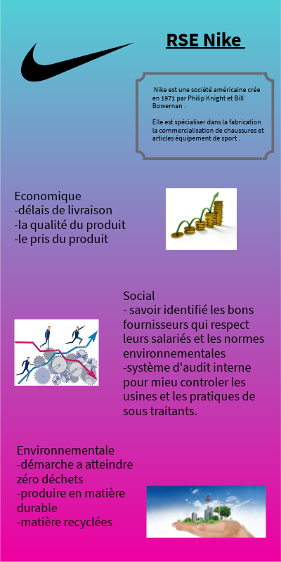 Nike est une socièté américaine crée en 1971 par Philip Knight et Bill Bowernan . Elle est spécialiser dans la fabrication la commercialisation de chaussures et articles équipement de sport .