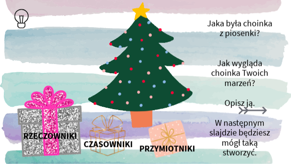 Jaka była choinka z piosenki? Jak wygląda choinka Twoich marzeń? Opisz ją. W następnym slajdzie będziesz mógł taką stworzyć.