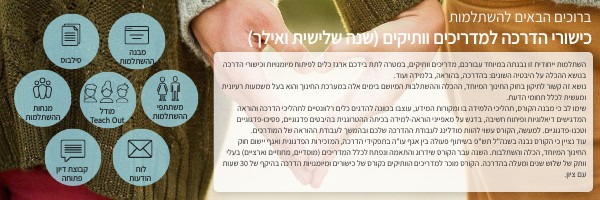 השתלמות ייחודית זו נבנתה במיוחד עבורכם, מדריכים וותיקים, במטרה לתת בידכם ארגז כלים לפיתוח מיומנויות וכישורי הדרכה בנושא ההכלה על היבטיה השונים: בהדרכה, בהוראה, בלמידה ועוד. נושא זה קשור לתיקון בחוק החינוך המיוחד, ההכלה וההשתלבות המיושם בימים אלה במערכת החינוך והוא בעל משמעות רעיונית ומעשית לכלל תחומי הדעת. שימו לב כי מבנה הקורס, תהליכי הלמידה בו ומקורות המידע, עוצבו בכוונה להדגים כלים רלוונטיים לתהליכי הדרכה והוראה המדגישים דיאלוגיות ופיתוח חשיבה, בדגש על מאפייני הוראה-למידה בכיתה ההטרוגנית בהיבטים פדגוגיים, פסיכו-פדגוגיים וטכנו-פדגוגיים. למעשה, הקורס עשוי להוות מודלינג לעבודת ההדרכה שלכם ובהמשך לעבודת ההוראה של המודרכים. עוד נציין כי הקורס נבנה בשנה"ל תש"פ בשיתוף פעולה בין אגף עו"ה בתפקידי הדרכה, המזכירות הפדגוגית ואגף יישום חוק החינוך המיוחד, הכלה והשתלבות. השנה עבר הקורס שידרוג והתאמה ונפתח לכלל המדריכים (מוסדיים, מחוזיים וארציים) בעלי וותק של שלוש שנים ומעלה בהדרכה. הקורס מוכר למדריכים הוותיקים כקורס של כישורים ומיומנויות הדרכה בהיקף של 30 שעות עם ציון.