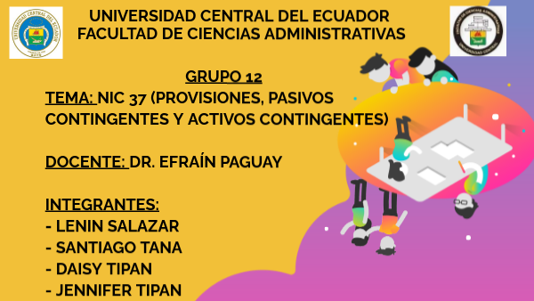 FACULTAD DE CIENCIAS ADMINISTRATIVAS GRUPO 12 TEMA: NIC 37 (PROVISIONES, PASIVOS CONTINGENTES Y ACTIVOS CONTINGENTES) DOCENTE: DR. EFRAÍN PAGUAY INTEGRANTES: - LENIN SALAZAR - SANTIAGO TANA - DAISY TIPAN - JENNIFER TIPAN