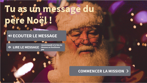 Cher enfant sage, Quelqu'un a volé ma hotte avec tous les cadeaux à l'intérieur! J'ai vraiment besoin de ton aide! Sauras-tu trouvé qui est le voleur? Où il a caché les cadeaux? Et quel stratagème il a utilisé pour me distraire pendant le vol ? Tu as 45 minutes pour réussir et sauver Noël! Hâte-toi !