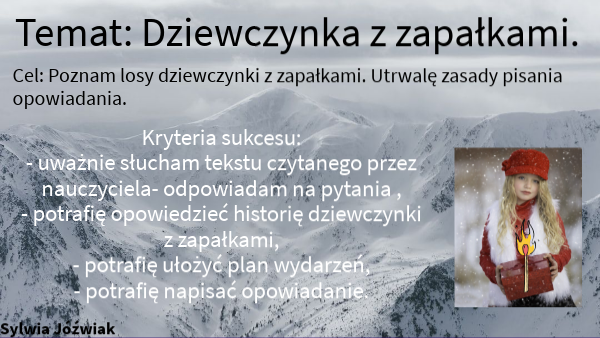 Cel: Poznam losy dziewczynki z zapałkami. Utrwalę zasady pisania opowiadania.