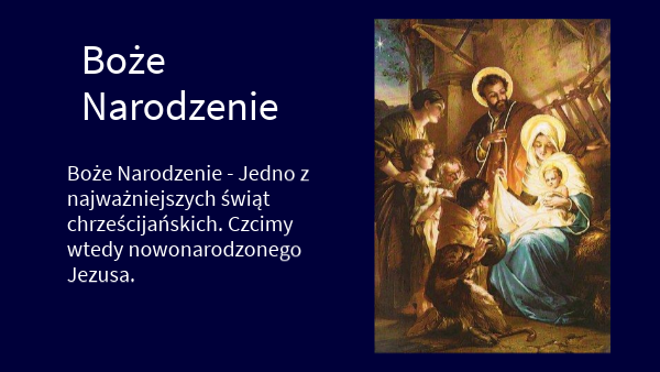 Boże Narodzenie - Jedno z najważniejszych świąt chrześcijańskich. Czcimy wtedy nowonarodzonego Jezusa.