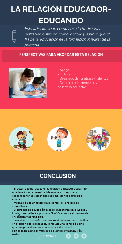 - El desarrollo del apego en la relación educador-educando obedecerá a una necesidad de cooperar, negociar y consensuar en los escenarios sociales donde participa el educand. - motivación es un factor clave dentro del proceso de aprendizaje. - El enfoque de educación basado en las fortalezas (López y Louis, 2009) refiere a posturas filosóficas sobre el proceso de enseñanza y aprendizaje. - la existencia de profesores que medien de manera efectiva en el aprendizaje de la lectura resulta una condición sine qua non para el acceso a los bienes culturales, la pertenencia a una comunidad de lectores y la inclusión social.