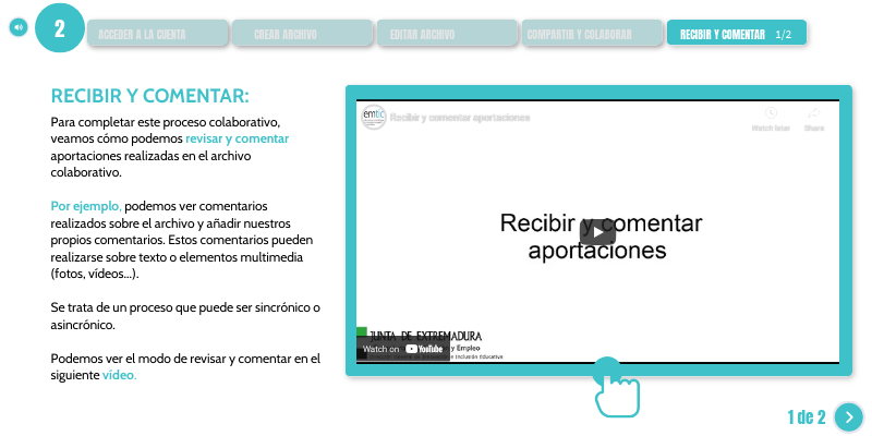 Para completar este proceso colaborativo, veamos cómo podemos revisar y comentar aportaciones realizadas en el archivo colaborativo. Por ejemplo, podemos ver comentarios realizados sobre el archivo y añadir nuestros propios comentarios. Estos comentarios pueden realizarse sobre texto o elementos multimedia (fotos, vídeos...). Se trata de un proceso que puede ser sincrónico o asincrónico. Podemos ver el modo de revisar y comentar en el siguiente vídeo.