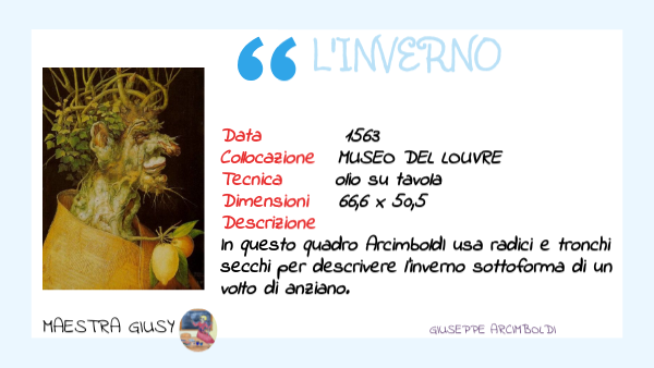 Descrizione In questo quadro ArcimboldI usa radici e tronchi secchi per descrivere l’inverno sottoforma di un volto di anziano.