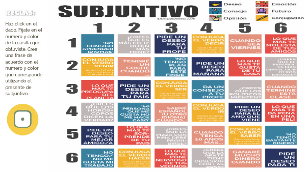 Haz click en el dado. Fijate en el numero y color de la casilla que obtuviste. Crea una frase de acuerdo con el numero y color que corresponde utilizando el presente de subjuntivo.