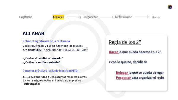 Decidir qué hacer y qué no hacer con los asuntos pendientes HASTA VACIAR LA BANDEJA DE ENTRADA: - ¿Cuál es el resultado deseado? - ¿Cuál es la acción siguiente?