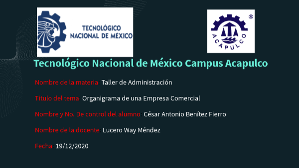 Nombre de la materia: Taller de Administración Titulo del tema: Organigrama de una Empresa Comercial Nombre y No. De control del alumno: César Antonio Benítez Fierro Nombre de la docente: Lucero Way Méndez Fecha: 19/12/2020