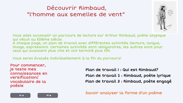 Vous allez accomplir un parcours de lecture sur Arthur Rimbaud, poète atypique qui vécut au XIXème siècle. A chaque page, un plan de travail avec différentes activités (lecture, langue, image, expression). Certaines activités sont obligatoires, les autres sont pour ceux qui avancent plus vite et ont terminé plus tôt. Vous serez évalués individuellement à la fin du parcours!