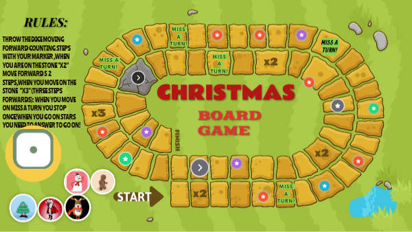 THROW THE DICE MOVING FORWARD COUNTING STEPS WITH YOUR MARKER ,WHEN YOU ARE ON THE STONE "X2" MOVE FORWARD S 2 STEPS,WHEN YOU MOVE ON THE STONE "X3" (THREE STEPS FORWARDS): WHEN YOU MOVE ON MISS A TURN YOU STOP ONCE!WHEN YOU GO ON STARS YOU NEED TO ANSWER TO GO ON!