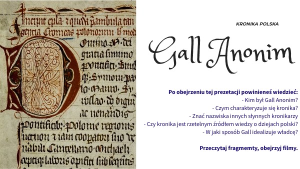 Po obejrzeniu tej prezetacji powinieneś wiedzieć: - Kim był Gall Anonim? - Czym charakteryzuje się kronika? - Znać nazwiska innych słynnych kronikarzy - Czy kronika jest rzetelnym źródłem wiedzy o dziejach polski? - W jaki sposób Gall idealizuje władcę? Przeczytaj fragmemty, obejrzyj filmy.