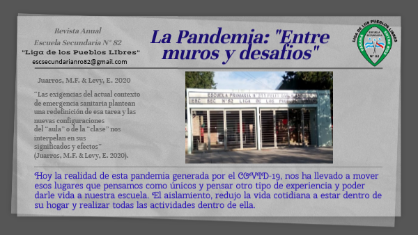 Al equipo docente por su arduo trabajo, su vocación de servicio y por apoyarnos en construir este sueño. Al equipo Pedagógico por su importante seguimiento y acompañamiento en todos los momentos de esta pandemia. Al equipo de preceptores por ser el lazo imprescindible con los estudiantes y sus familias. Gracias al editor de esta revista por acompañar decisiones, desafios, locuras y sueños. A todos los que forman parte de esta hermosa familia de la Esc. Sec. N° 82 "Liga de los Pueblos Libres".
